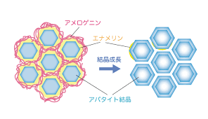 エナメル質が作られる際の分子環境を人工的に再現(生体模倣:biomimetic)しています。