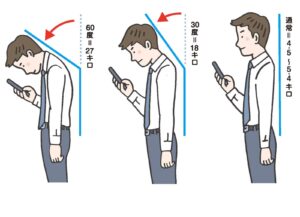 しかしスマホを見るとき、多くの人は画面をのぞき込むように首を前に倒します。