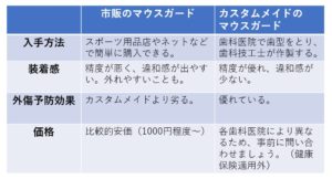 市販のマウスフォームドタイプは比較的安価で選手自身がお湯で軟化させて成型しますが、適切な調整ができないため違和感が強い場合もあり、呼吸がしにくい、外れやすいといった問題点が出ることもあります。