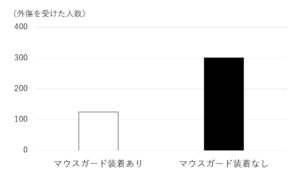 その結果、マウスガード非装着時に口腔外傷を受けた競技者の人数は、装着時の人数より2.4倍も多くなりました(図2)。